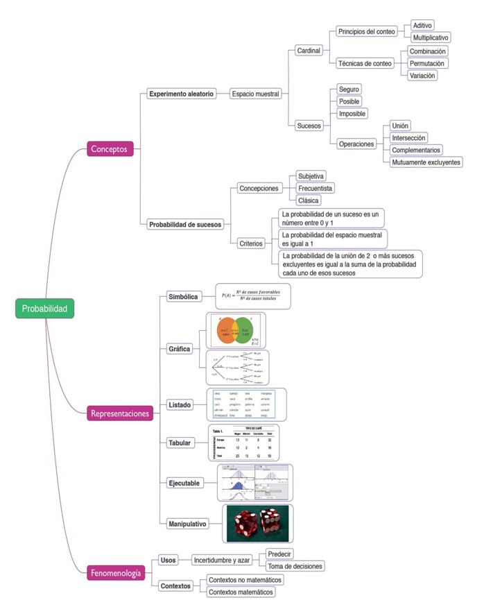 Por último, en la literatura se promueve que se desarrollen temas como el espacio muestral, sucesos complementarios, mutuamente excluyentes y el uso de listas organizadas, objetos manipulativos como dados o monedas y diagramas de árbol (Pareja, 2011). La enseñanza de los principios de multiplicación (multiplicativo y aditivo) y las técnicas de conteo (permutación, variación y combinación) pueden abordarse en primaria de manera intuitiva (Ramos, 2016). La tecnología juega un papel relevante para aprender probabilidad: se deben usar recursos tecnológicos para observar los distintos resultados de un experimento aleatorio y fortalecer los conceptos probabilísticos (Alsina, 2016; Tsakiridou y Vavyla, 2015).