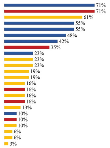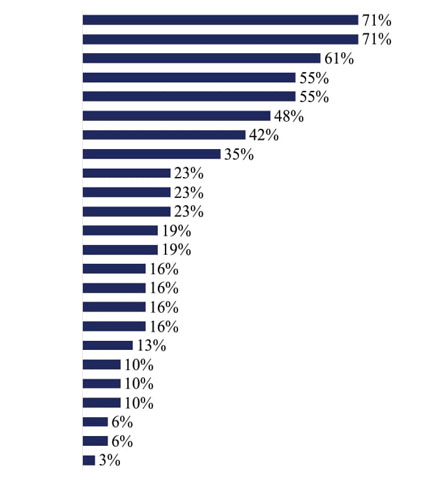 En lo que sigue, presentamos los resultados de la codificación de los documentos de los 31 países que sí incluyen temas específicos de probabilidad en sus currículos. En la figura 3, mostramos los códigos con base en sus frecuencias porcentuales organizadas de menor a mayor frecuencia. Identificamos lo que es más y menos común en los currículos de estos países.