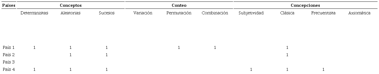 Encontramos que aproximadamente 25% de los países considera la enseñanza de nociones de conteo. La técnica de combinación tiene la mayor frecuencia (19%), seguida por la permutación con 6%. Los criterios de probabilidad se enseñan únicamente en uno de los países de la muestra.