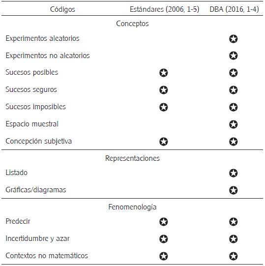 El documento de los Derechos básicos de aprendizaje (DBA) no tiene un marco conceptual en el que se pueda identificar información respecto al pensamiento aleatorio. No obstante, encontramos segmentos de texto que hacen referencia a los temas que se deberían abordar en probabilidad en cada uno de los grados de la escuela en Colombia. Por lo tanto, codificamos la información que encontramos para los grados de primero a cuarto de primaria.