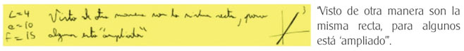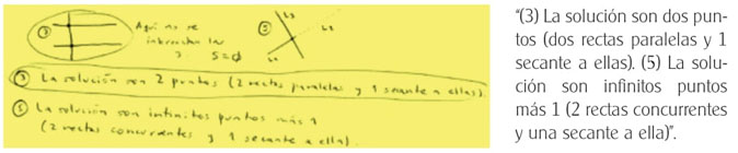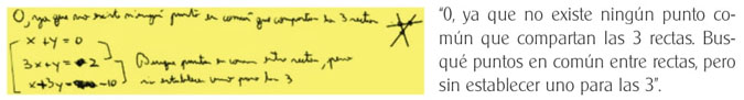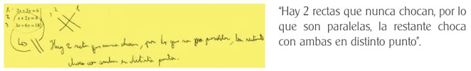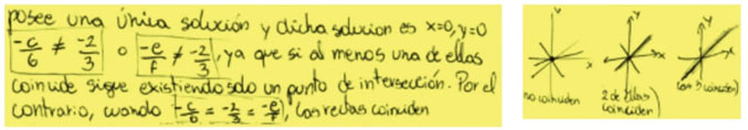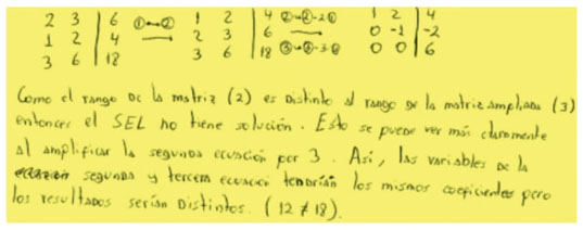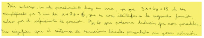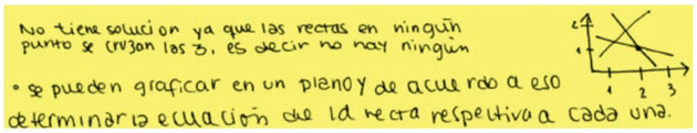 Por otro lado, en la figura 12 se aprecia un extracto de la respuesta de P7 a la pregunta 4, quien hace referencia explícita a la presencia de rectas paralelas cuando hay pares de ecuaciones con coeficientes que son múltiplos, hecho que lo lleva a suponer que el SEL no tiene solución.