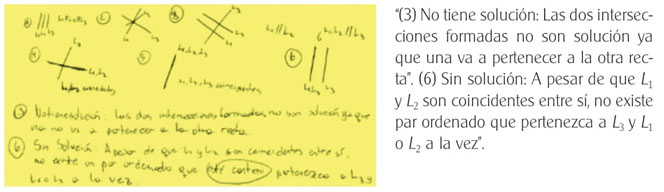 Por otro lado, como se aprecia en la figura 9, P12 logra mostrar las distintas posibilidades de representar geométricamente un SEL 3x2, lo que le permite determinar cuándo el CSSEL es vacío y también aquellos casos en que hay solución. Por último, P12 deja en claro que una solución es aquel punto común a todas las rectas que están relacionadas con el SEL. En la respuesta de P12 se evidencia una comprensión del CSSEL 2x3 en el modo SG, considerando que la dirección de las rectas no interfirió en el número de posibilidades que tuvo para representar un SEL 3x2.