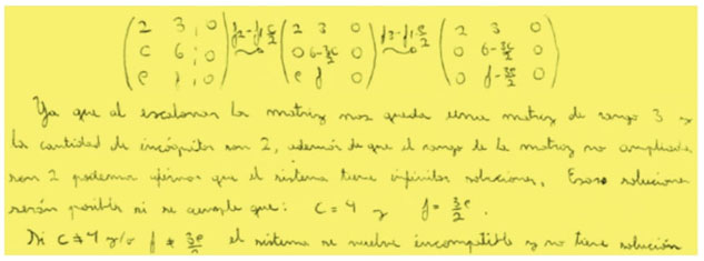 Caso 2: En relación con el resto de los argumentos, destaca la respuesta de P9 a la pregunta 4, porque en ella: (1) aplica correctamente el método de Gauss-Jordan, (2) compara las ecuaciones cuyos coeficientes generaron ceros en la matriz ampliada, y (3) interpreta ese hecho desde el campo de los números reales. Esta manera de proceder de P9 sugiere una articulación entre los modos AA y AE mediante las propiedades de suma y multiplicación del campo de los números reales. Cabe mencionar que esta forma de proceder no fue evidenciada en los informantes del Caso 1, por el contrario, I4 en su respuesta a la pregunta 2 no logra aplicar la propiedad “absorbente del cero” para establecer que un SEL homogéneo siempre incluye en su CS la solución trivial.