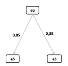 En el grafo implicativo de la figura 16 aparecen las implicaciones e6 → e5 y e6 →e3 que ponen de relieve las estrategias e3, e5 y e6. De la primera implicación se supone que hay informantes que relacionan rectas paralelas o coincidentes con ecuaciones cuyos coeficientes son proporcionales. En la figura 16 se presenta el grafo implicativo para las categorías de análisis en el Caso 1 y, en la figura 17, el respectivo grafo para el Caso 2. En particular se muestran aquellas implicaciones con un índice de implicación igual o superior a 0,85. Ese índice debe ser entendido como la probabilidad que se asocia al número de contraejemplos que debilitan la implicación 1 → 0, en un sentido clásico. Es ese el procedimiento que utiliza CHIC para desplegar implicaciones mediante un grafo implicativo, asignando un índice de implicación.