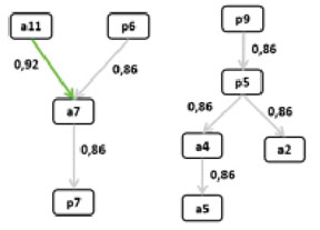 En el grafo implicativo de la figura 17 se aprecian dos grupos de implicaciones que incluyen procedimientos matemáticos y argumentos. Del primer grupo se desprenden las siguientes cadenas de implicaciones (a11 → a7 → p7) y (p6 → a7 → p7), a través de las cuales se evidencia lo conveniente que resultó resolver un SEL 3x2 cuando se mezclan ecuaciones homogéneas y no homogéneas agregando algunos parámetros a sus coeficientes, porque ante la dificultad de aplicar el método de Gauss-Jordan se puede recurrir a otros procedimientos matemáticos y/o activar los aspectos geométricos que están implícitos en la resolución de un SEL n×2. Por otro lado, en el segundo grupo, destacan las cadenas (p9 → p5 → a4 → a5) y (p9 → p5 → a2) que muestran qué tan probable resulta asociar los coeficientes de las ecuaciones de un SEL 3x2 con la posición relativa de sus rectas, al determinar si los coeficientes de las ecuaciones son proporcionales o no.