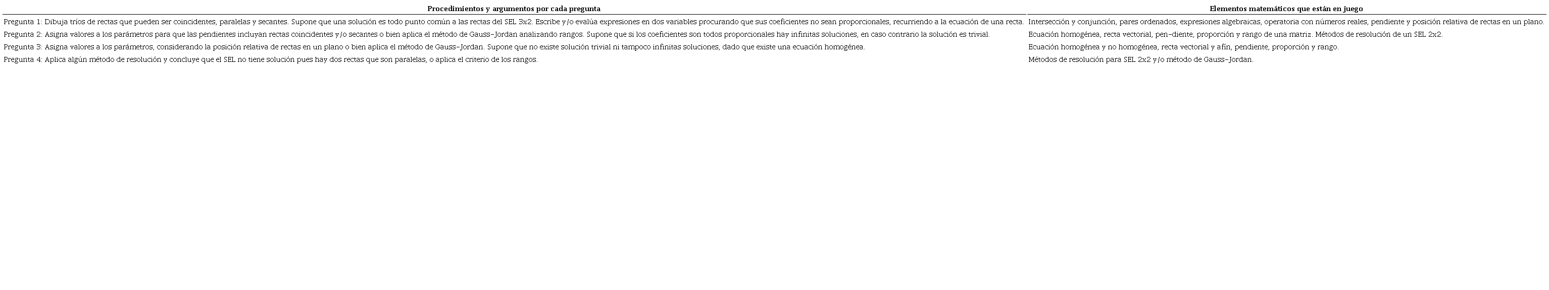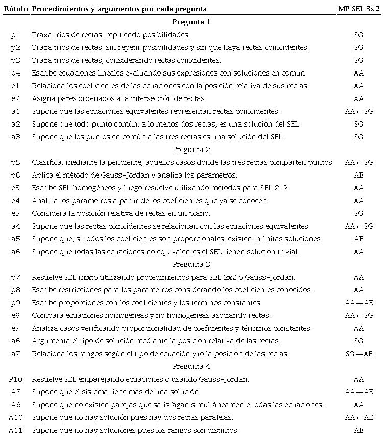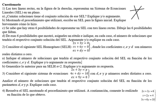 Cabe indicar que el motivo de utilizar un único instrumento para la recolección de información, además de estimular el uso de diferentes procedimientos y estrategias, fue indagar si un estudiante puede combinar técnicas que se utilizan en un SEL 2x2 para resolver un SEL 3x2 o bien saber de qué manera dichas técnicas se activan cuando un estudiante utiliza el método de Gauss-Jordan cuando se incorporan parámetros a las ecuaciones de un SEL 3x2. Por otro lado, quisimos saber si el uso de parámetros en los coeficientes de un SEL 3x2 homogéneo estimula a un estudiante a articular los aspectos geométricos y algebraicos subyacentes a un SEL 3x2.