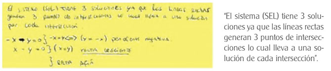 De igual manera E4 reconoce que la posición relativa de las tres rectas no aporta soluciones al SEL, como se observa en la figura 4. Aunque E4 no escribe un SEL, declara que mediante la ecuación de una recta es posible hacerlo. Dicho procedimiento -utilizar convenientemente un sistema de coordenadas rectangular para aplicar la fórmula “punto pendiente” y obtener la ecuación de la recta- favorece un tránsito entre los modos SG y AA. Con ello se refuerza la relación de un SEL 3x2 y la representación geométrica mediante los puntos de intersección de las rectas, lo que podría ser un camino para avanzar a la idea de solución en este tipo de SEL. En efecto, E4 se aproxima al tema desde el modo SG y, a nuestro parecer, el tránsito al modo AA es correcto, dado que, al intentar responder la pregunta, la cual comienza por pedir un sistema de ecuaciones que sea una instancia de la situación propuesta, escribe un sistema adecuado. Con ello E4 muestra claridad en cuanto al tránsito del modo SG al AA, cosa que E3 no tenía.