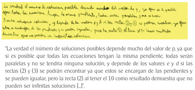 En la figura 6 se presenta un extracto de la respuesta que dio E2 a la pregunta 3, quien se enfoca en el parámetro p de la primera ecuación para inferir que el CSSEL no puede ser vacío, en la posibilidad de existir proporcionalidad entre los coeficientes y términos constantes con la segunda ecuación. Cabe destacar que la idea de múltiplo en los coeficientes y términos constantes de un SEL, que incluye ecuaciones homogéneas y no homogéneas, permite activar un tránsito entre el modo SG y AA, relacionando rectas paralelas o coincidentes.
