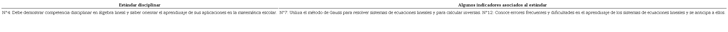 El Estado de Chile está llevando a cabo lo que se conoce como Programa Inicia. Este considera estándares referenciales de desempeño para la formación de profesores de todas las disciplinas y una prueba para los egresados que incluye diferentes instrumentos. En esos estándares orientadores se explicitan indicado-res que dan cuenta de un dominio y desempeño para cada nivel disciplinar (MINEDUC, 2012). En la tabla 1 se presenta el estándar disciplinar y los correspondientes indicadores de desempeño para el tema SEL, que se han propuesto para la formación de los estudiantes de Pedagogía en Matemática.