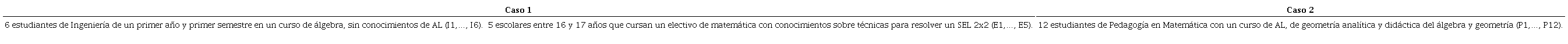 Los estudiantes de Ingeniería formaban parte de un curso de álgebra que se dicta en el primer semestre de su carrera, asignatura que no incluye el tema SEL. Por otro lado, los estudiantes de secundaria cursaban el plan electivo de matemática, instancia al cual optan quienes desean estudiar una carrera universitaria del área científica. El criterio de selección de los escolares fue tener un buen rendimiento en la asignatura de Matemática del plan común. Nuestro Caso 1 representan la transición entre la enseñanza secundaria y la universitaria para observar de qué manera influye la matemática escolar en la resolución de un SEL 3x2; con este caso se buscó observar si es posible extrapolar técnicas para resolver un SEL 2x2 en uno de 3x2. Por último, cabe indicar que los estudiantes de Pedagogía en Matemática, Caso 2, ya habían cursado asignaturas como AL y geometría analítica, además de un curso de didáctica del álgebra y la geometría. Con el Caso 2 nos propusimos indagar cómo el conocimiento de AL incide en la resolución de un SEL y, por ende, en la comprensión del CSSEL 3x2.