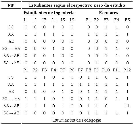 En la tabla 6, considerando las distintas preguntas del cuestionario y los dos casos de estudio, presentamos un panorama global de la activación de los MP para cada uno de los integrantes en cada caso. Para ello hemos considerado un 1 para dar cuenta de la activación de un modo y/o el respectivo tránsito entre estos y un 0 para la no activación.