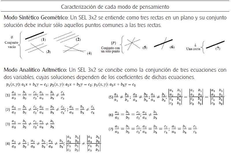 Sierpinska (2000) identifica dos modos generales de pensar la matemática: (1) el pensamiento práctico que se genera con el fin de obtener algo en concreto y se interesa por la acción sobre los hechos concretos de la matemática, y (2) el pensamiento teórico que se produce en el hecho puro de pensar y se interesa en las relaciones sobre sistemas de conceptos de la matemática. Con la finalidad de hacer explícito el pensar teórico para el AL, Sierpinska (2000) describe con base en el pensar teórico y práctico tres modos de pensamiento: el Sintético Geométrico (SG), el Analítico Aritmético (AA) y el Analítico Estructural (AE). En el modo SG, el pensamiento procura describir el objeto que percibe de manera intuitiva, más allá de una definición o propiedades que lo caractericen. En el modo AA los objetos son presentados a través de relaciones aritméticas haciendo uso de -adas o ecuaciones. En el modo AE se utilizan axiomas, propiedades y teoremas que caracterizan al objeto matemático en cuestión. Cabe indicar que esos MP no son secuenciales ni revisten un grado de importancia uno respecto del otro. Sin embargo, en su conjunto, permiten a un estudiante acceder y comprender de manera profunda un concepto matemático, que en nuestro caso estará referido a los SEL 3x2.