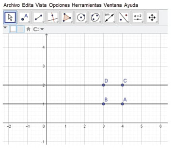 Las resoluciones que algunos y algunas docentes-estudiantes elaboraron se apoyaron en el uso de las herramientas que GeoGebra habilita (Recta Paralela y Recta Perpendicular) y que garantizan que, al mover la recta original, se preserva el paralelismo y la perpendicularidad, tal como esperábamos. El docente-estudiante Vito, cuando abrió el programa, obtuvo en la pantalla una representación de ejes cartesianos y una cuadrícula. En esa ventana trazó una recta con la herramienta Recta por dos puntos (A y B) apoyándose en una de las líneas horizontales de la cuadrícula. Luego ubicó dos puntos C y D, fuera de la recta, pero sobre “vértices de la cuadrícula”, formando un “cuadrado”. Después, trazó una recta “paralela” por D y C usando la herramienta Recta, como se observa en la figura 1.
