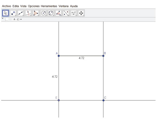 A continuación, recurrieron a la siguiente idea, que nos parece muy interesante: usando la herramienta Segmento de longitud dada trazaron un segmento con un extremo en A y luego ingresaron en la casilla que abre el programa la leyenda “AB”. Es decir, lograron un vínculo entre el segmento AB y el nuevo segmento AE (figura 5).
