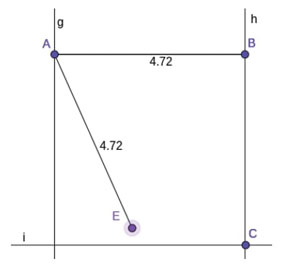A nuestro entender, Laura y Eugenia tuvieron presentes las relaciones que definen al cuadrado. Primero garantizaron los cuatro ángulos rectos (aunque por las características de la construcción, finalmente algunos ángulos interiores no terminaron midiendo 90°). Luego, construyeron un segmento AE de la misma longitud que AB (es más, lograron que esta relación se preserve al mover A o B) y después lo ubicaron sobre la recta g. Finalmente movieron C para que recta i pase por E. Estos últimos dos pasos los hicieron a “ojo”. Por lo tanto, al no hacer explícitas, mediante las herramientas del programa, estas nuevas condiciones de la construcción, el cuadrado se deforma. Parafraseando a Eugenia, nos podemos preguntar: ¿las docentes-estudiantes no conocían todavía el “código” del GeoGebra? ¿O directamente no les importaba que se “desarmara” porque ellas querían lograr que fuera un cuadrado “en la foto”?