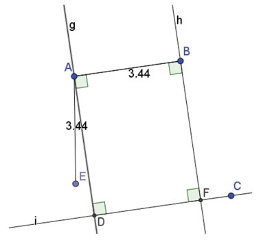 Analicemos la construcción de las docentes-estudiantes. Primero construye-ron un segmento AB utilizando la herramienta Segmento. Es decir, tanto A como B son puntos libres. Luego, utilizando la herramienta Perpendicular, trazaron dos rectas perpendiculares (g y h) al segmento, una que pasa por A y otra por B, como se muestra en la figura 3.