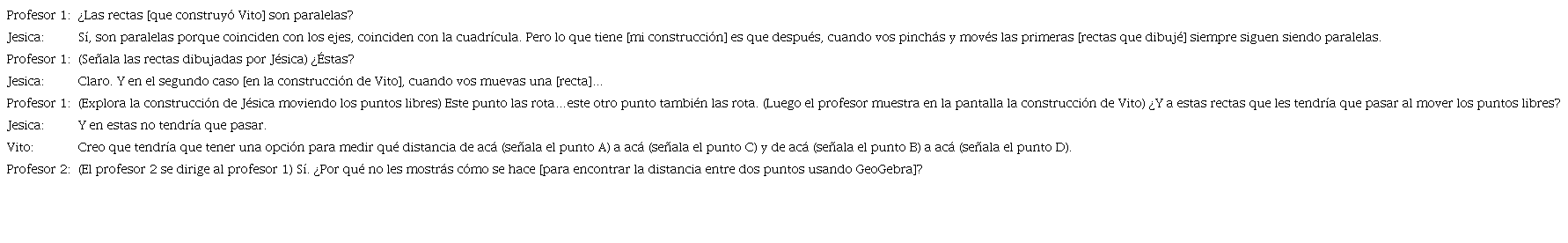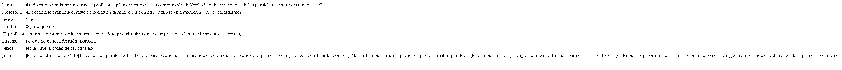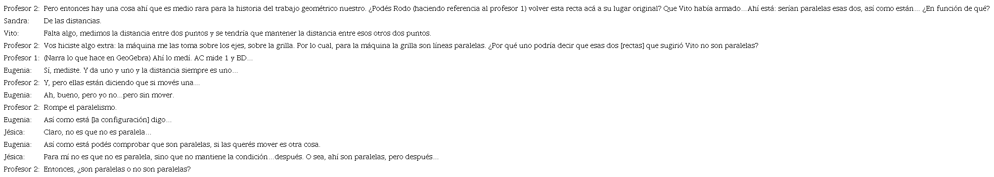 Nuevamente aquí se produce una diferencia entre los conocimientos de Eugenia y los de Jésica. Las docentes-estudiantes interpretaron de manera distinta la invitación del profesor sobre cómo asegurar que las rectas en cuestión eran paralelas. Al igual que Vito, Eugenia apeló a sus conocimientos geométricos dentro del entorno del lápiz y papel argumentando el paralelismo mediante las distancias iguales. Cuando el profesor mencionó el desplazamiento, su respuesta fue “si las querés mover es otra cosa”. Mientras que Jésica nuevamente estaba pensando en el movimiento; esto se infiere de la frase “sino que no se mantiene la condición...después”. Lo interesante de la palabra “después” es que trae aparejada la noción del tiempo. Jésica no dudó del paralelismo de las rectas, pero para ella lo eran en ese momento, luego no necesariamente lo serían. El sentido que le otorga cada una al “después” provienen de diferentes conocimientos.