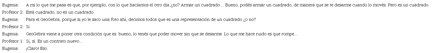 En este extracto se pone en evidencia la tensión entre las condiciones de trabajo con lápiz, papel e instrumentos de geometría y las que, de alguna manera, propician el uso de GeoGebra, a partir del movimiento. Entendemos que esta docente-estudiante, está acostumbrada a un tipo de trabajo en donde lo perceptivo sigue primando, aunque identifique ciertas propiedades. Si bien en el discurso se manifiesta la necesidad de hacer explícitas las relaciones que se ponen en juego al realizar una construcción, ella destaca que, visualmente, se está representando un cuadrado, sin importar el movimiento. En términos de Olivero (2003), tuvieron en cuenta un foto-desplazamiento. Es decir, a esta pareja de docentes-estudiantes le importa el estado inicial y el estado final del dibujo, con la intención de lograr una figura determinada.