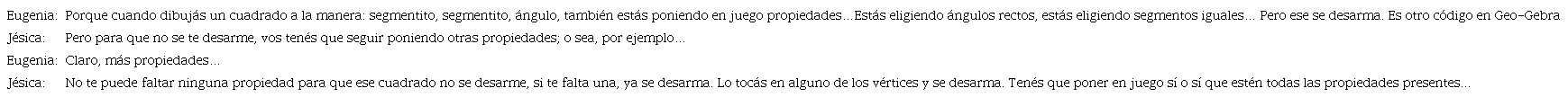 Eugenia hace un comentario que nos interesa destacar y que parafraseamos así: una construcción que se deforma puede estar apoyada en propiedades geométricas. Para ella, el hecho de no soportar el arrastre está vinculado a un código de GeoGebra, a una cuestión tecnológica y no geométrica. En relación con este asunto, notemos que tanto Eugenia como Jésica mencionan que para lograr que una construcción no se “desarme” hay que usar más propiedades o poner en juego todas las propiedades presentes en la figura, afirmación que refleja la necesidad de generar condiciones para trabajar la noción de “definición de figura”, en este caso del cuadrado. Compartimos con Zazkis y Leikin (2008) en este punto que “las definiciones de conceptos matemáticos, las estructuras subyacentes de las definiciones y el proceso de definir resultan componentes fundamentales del conocimiento de la materia de los profesores de matemáticas” (p. 133).