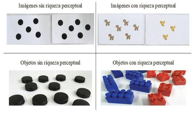 Ahora bien, no todas las imágenes ni todos los objetos tienen las mismas propiedades. Por ejemplo, las imágenes de los libros infantiles con contenido numérico suelen ser dibujos coloridos de personas, animales y objetos. Muchas veces estos libros tienen solapas desplegables o distintas texturas con la intención de estimular el interés y focalizar la atención de los niños. En cuanto a las colecciones de objetos que se utilizan en los juegos cotidianos o en las salas del jardín de niños, se destacan los autos, ladrillos de construcción, elementos para enhebrar, bloques, entre otros, que por regla general son de diferentes formas, tamaños, texturas y colores. En otras palabras, las imágenes y las colecciones de objetos disponibles en muchos hogares y jardines de niños suelen tener características físicas salientes (colores intensos, texturas, variadas dimensiones), un conjunto de rasgos que algunos autores denominan riqueza perceptual (Kaminski et al., 2009; Petersen y McNeil, 2012) debido a la intensidad y variedad de las propiedades físicas de los materiales.