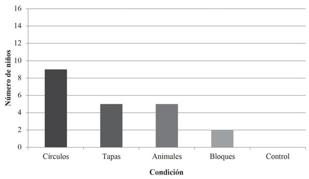 En primer lugar, se comparó el desempeño entre las cinco condiciones (cuatro de intervención y la condición control) empleando la prueba Kruskal-Wallis, cuyo resultado arrojó diferencias significativas ( = 14.92, p = .005). Las comparaciones de a pares (prueba U de Mann-Whitney) reflejaron dos patrones de resultados interesantes. Por un lado, al comparar el desempeño de cada condición de intervención con el desempeño de la condición control (0%), se hallaron diferencias en las condiciones círculos (56%) (U = 56, p < .001), tapas (31%) (U = 88, p = .017) y animales (31%) (U = 88, p = .017). El desempeño de la condición bloques (13%) no se diferenció estadísticamente del desempeño de la condición control (U = 112, p = .151).