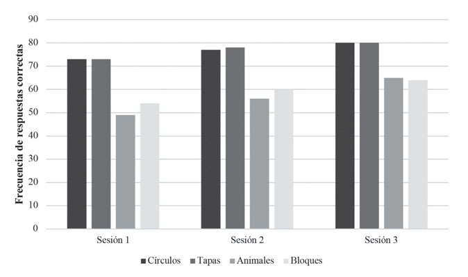 Al interior de la condición animales los resultados indicaron también diferencias significativas (χ2(2) = 14.00, p = .001), pero las comparaciones de a pares mostraron un efecto de la intervención más progresivo que en las condiciones círculos y tapas. El desempeño en la segunda sesión (70%) fue superior al de la primera (61%) (Z = -2.33, p = .020) y el desempeño en la tercera sesión (81%) fue superior al de la primera y la segunda sesión (Z = -2.85, p = .004 y Z = -2.16, p = .030, respectivamente).