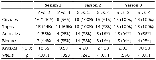 Un perfil similar de resultados surge en la condición tapas, en la que el desempeño fue superior que en las condiciones bloques (sesión 1: U = 72, p = .015; sesión 2: U = 40, p < .001; sesión 3: U = 32, p < .001) y animales (sesión 1: