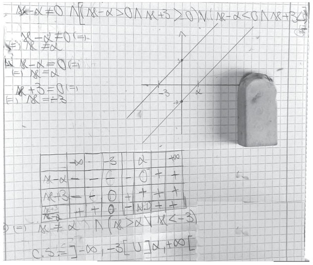 Os alunos começaram por escrever a condição com conectores lógicos, tentaram escrever o sinal do quociente a partir da análise das representações gráficas do numerador e do denominador da fração e concluíram a resolução com uma tabela que resumia a informação, permitindo-lhes escrever o conjunto-solução da condição.