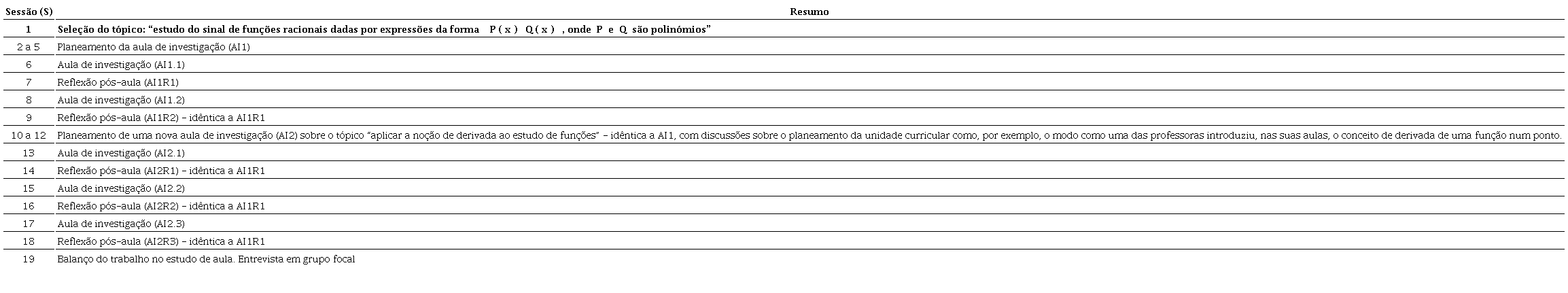 O estudo de aula decorreu entre novembro de 2019 e fevereiro de 2020 e teve 19 sessões, com duração variável entre 20 e 125 minutos. No início do estudo de aula, as professoras decidiram planear uma aula de investigação, com dois tempos de 45 minutos, no domínio “Funções reais de variável real”, transversal ao currículo do ensino secundário, baseando-se na sua experiência e nas dificuldades que os seus alunos costumam ter. A tabela 1 apresenta um resumo das sessões do estudo de aula.