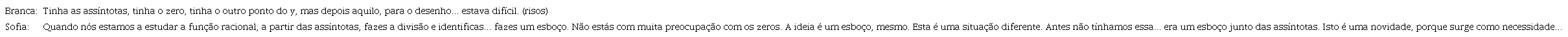 As professoras sequenciaram as questões para que os alunos começassem por um caso mais simples, o quociente de dois polinómios de grau 1, aumentando gradualmente o grau de dificuldade, como podemos ver nesta conversa entre elas:
