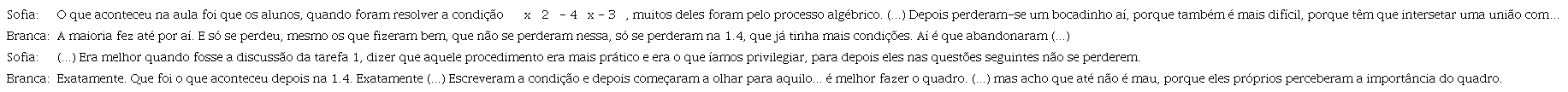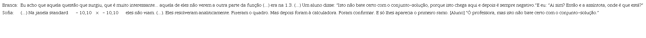 As professoras refletiram também sobre as dificuldades dos alunos que tentaram fazer a resolução algébrica com conectores lógicos, nas questões 1.3 e 1.4 na primeira aula (AI1.1). Depois de determinarem os zeros dos polinómios do numerador e denominador, muitos alunos tiveram dificuldade em determinar o conjunto-solução da condição: