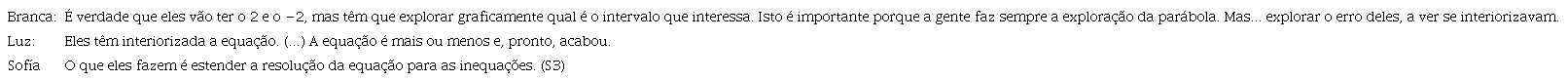 Nesta discussão, as professoras refletiram sobre as razões que podem levar os alunos a cometer este erro e referiram que pode estar relacionado com a ana-logia que eles estabelecem entre a resolução da equação e a da inequação associada.