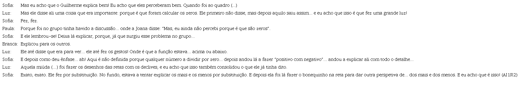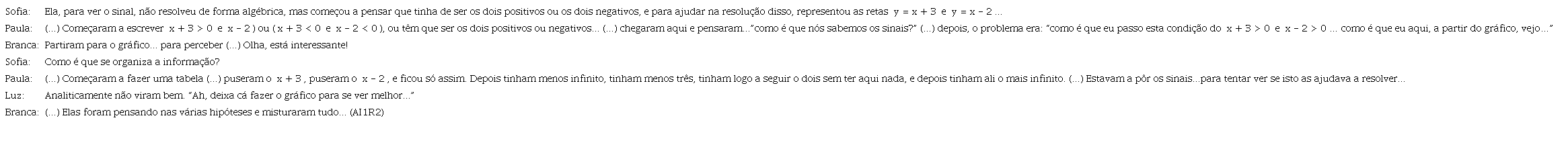Depois da segunda aula (AI1.1), as professoras discutiram a forma como um aluno explicou a sua resolução à turma e como outra aluna apresentou uma outra estratégia (baseada na representação gráfica) para identificar os sinais do numerador e denominador da fração:
