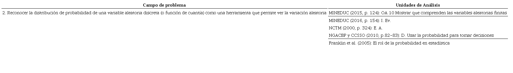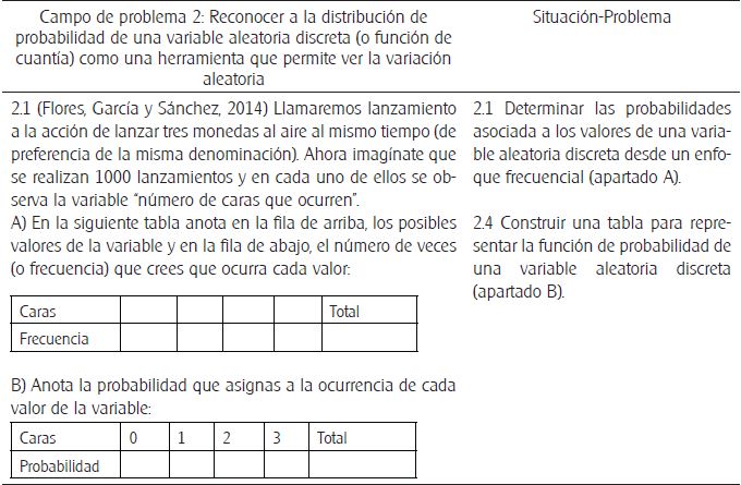 Aquellos campos de problema fueron establecidos en un proceso cíclico e inductivo por medio del análisis a la epistemología de la variable aleatoria (Amrani y Zaki, 2015; Dinges, 2005; Ruiz, 2013). También este aspecto ha sido indagado en la distribución binomial (García-García et al., 2022; Vilca, 2015) y distribución normal (Stahl 2006; Tauber, 2001). Así se obtuvieron los siguientes:
