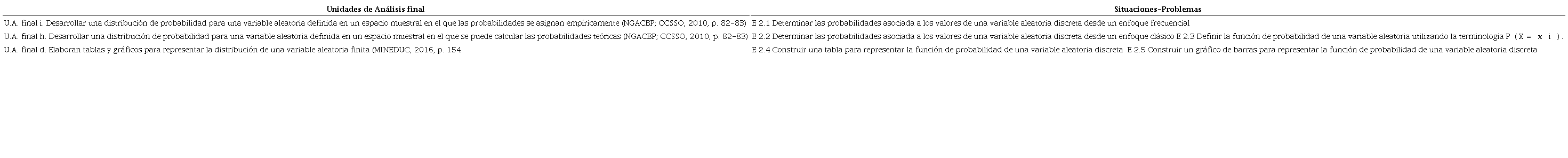 Posteriormente, a partir de las Unidades de Análisis final se procedió a inferir situaciones-problemas (S-P) alusivas a la comprensión de la variable aleatoria y distribuciones de probabilidad, donde se presentaron los siguientes casos: (i) una U.A. final originó una única situación-problema; (ii) una U.A final originó dos o tres situaciones-problemas, ejemplo de ello se muestra en la tabla 2.