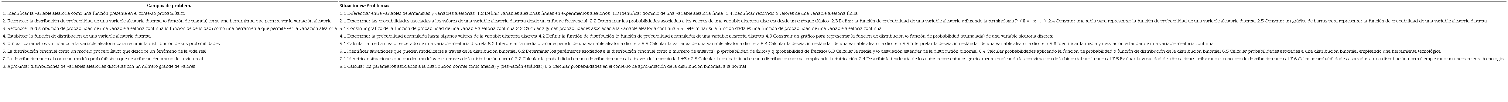 El sexto y séptimo campo de problema, constituidos por cinco y seis situaciones-problemas respectivamente, trabajan la aplicación de la variable aleatoria en los modelos de probabilidad, para las de tipo discreta (modelo binomial) y continuas (modelo normal) correspondientemente. El octavo y último campo de problema, constituido por dos situaciones-problemas, está relacionado a la aproximación de la distribución binomial por la normal.