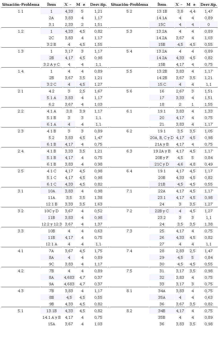 En tres situaciones-problemas (1.4, 6.2 y 7.4), un par de ítems fueron evaluados con la misma puntuación media, seleccionándose aquel con mayor mediana. En concreto, para la situación problema 1.4, los ítems 1 y 3.2C, poseen igual media (4 puntos), entonces fue seleccionado el ítem 3.2C, cuya mediana es 4,5 puntos.
