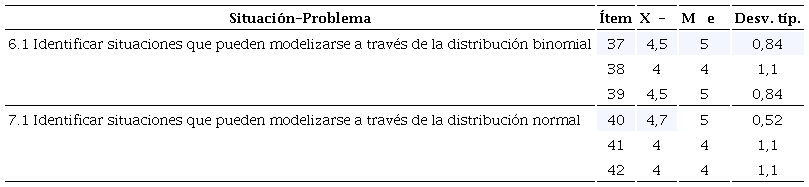 Respecto a la segunda sección del documento presentado a los expertos, donde se abordan situaciones-problemas acerca de distribuciones de probabilidad fundamentadas en la alfabetización estadística, la tabla 5 contiene los resultados sobre su valoración. En ella ha sido posible observar que se presentó el caso que una de las situaciones-problemas (6.1) obtuvo dos ítems calificados con igual media, mediana y desviación típica. Por tanto, ha sido escogido aquel, en que el estudiante debe poner en juego habilidades como evaluar e interpretar la información estadística presente en su enunciado, más que realizar procedimientos (algoritmos, operaciones, etcétera).