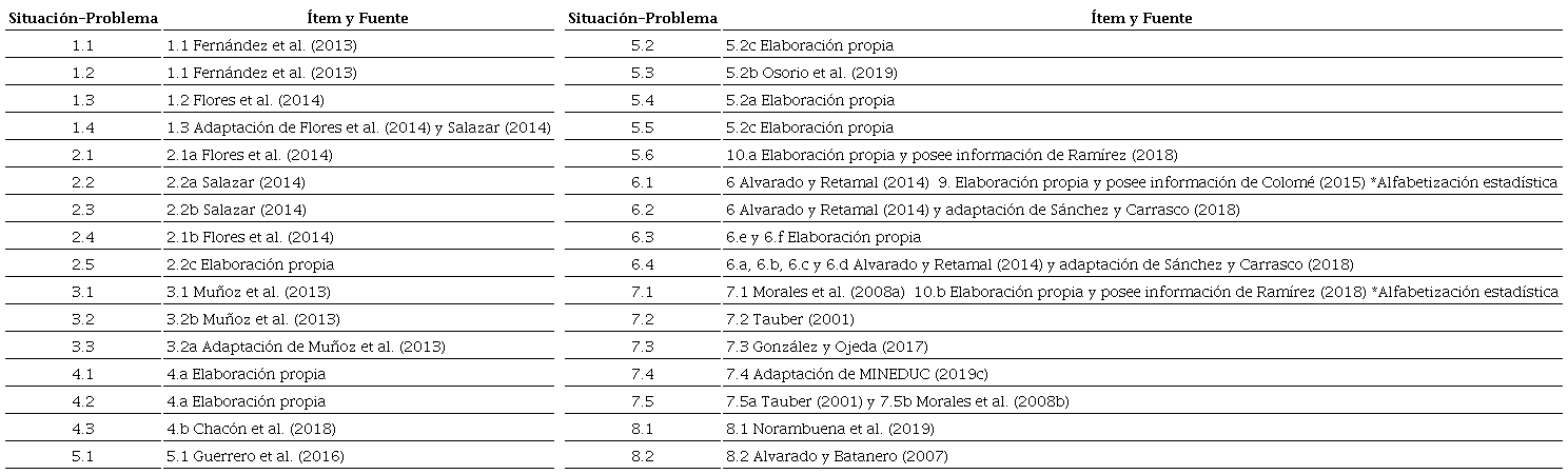 A continuación, se muestra la selección de cada ítem representante de una situación-problema a través de la valoración por juicio de expertos. Es importante mencionar que, en las fases de selección de ítems a partir de la literatura y elección según juicio de expertos, se han excluido dos situaciones-problemas (6.5 y 7.6), debido a que se proyecta que el conjunto final de ítems sea aplicado a estudiantes individualmente y en forma presencial o en línea. Además, en las fases señalas se incluyeron ítems para valorar dos situaciones-problemas (6.1 y 7.1) fundamentadas en la alfabetización estadística en términos de Gal (2002), con el propósito de aportar con información sólida y empírica a la investigación de esta área.