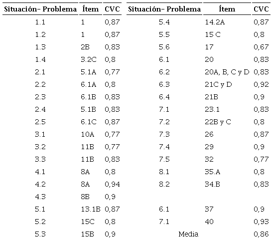 Finalmente, para analizar el grado en que cada ítem seleccionado se ajustó a una situación-problema, los resultados también fueron examinados a través del Coeficiente de Validez de Contenido (CVC) de Hernández-Nieto (2002) que per-mite valorar el grado de acuerdo de los expertos respecto a cada uno de los diferentes ítems y al instrumento en general. Para interpretar el CVC de un ítem se tuvo en cuenta la siguiente escala: (i) ítem inaceptable (CVC < 0,60); ítem deficiente (0,60 ≤ CVC ≤ 0,70); (iii) ítem adecuado (0,70 < CVC ≤ 0,80); (iv) ítem bueno (0,80 < CVC ≤ 0,90); (v) ítem excelente (0,90 < CVC). De esta manera se consideraron aceptables los ítems con un coeficiente de validez y concordancia mayor que 0,70.