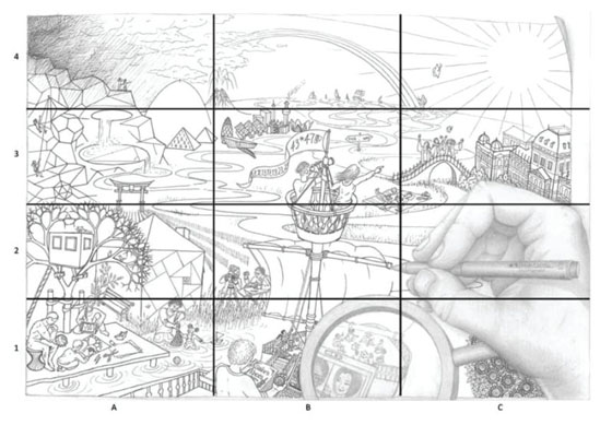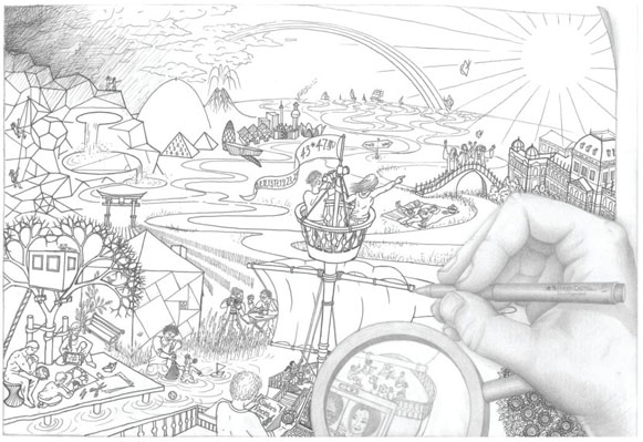 El profesor, representado por el capitán en primer plano del barco, se dedica al desarrollo profesional, consultando un libro, pero también aprendiendo en la práctica (cf. Bakkenes et al., 2010, sobre experimentación, uso de recursos, etc.). Además de la graduación, hay otros tipos de objetivos para maestros y estudian-tes por igual, como la equidad, el afecto positivo y el uso fluido de la tecnología. Durante su viaje (y parcialmente en casa, que se muestra en la esquina inferior izquierda), los estudiantes aprenden a orientarse matemáticamente en el mundo (por ejemplo, árbol fractal, lago elíptico, una montaña parabólica y varios sólidos platónicos). En su camino hacia varios objetivos, tanto el maestro como los estudiantes usan tecnología particular (por ejemplo, brújula, binoculares, tableta, computadora portátil). La lupa (que representa la investigación) se acerca a la pantalla de una computadora portátil que retrata la educación a distancia, insinuando el consenso de que la pandemia magnifica algunos problemas que la educación ya enfrentaba (por ejemplo, la brecha digital).