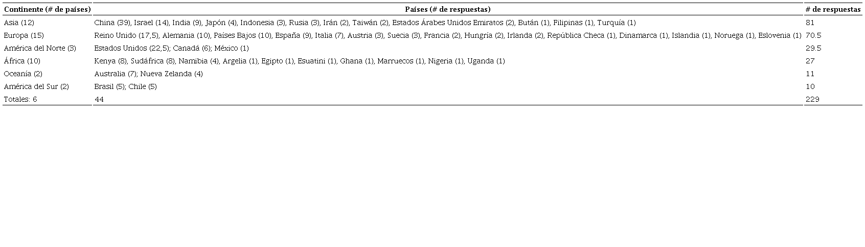 Administramos la encuesta de 1 pregunta a través de listas de correo electrónico que conocíamos (por ejemplo, Becker, ICME, PME) y pedimos a los investiga-dores de educación matemática que la difundieran en sus redes nacionales. Al 16 de octubre de 2019, habíamos recibido 229 respuestas de 44 países de 6 continentes (tabla 1). Aunque estábamos contentos con la magnitud de la respuesta recibida, mayor a la que recibió Sfard (2005) (74, con 28 de Europa), no sabemos qué tan bien hemos llegado a regiones particulares y, si los encuestados potenciales podrían haber enfrentado barreras lingüísticas u otras. Ofrecimos a algunos encuestados chinos la opción de escribir en chino porque el segundo autor se ofreció a traducir sus correos electrónicos al inglés. También recibimos respuestas en español, que fueron traducidas para nosotros.