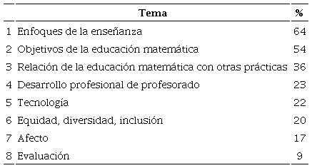 El tema mencionado con mayor frecuencia fue lo que denominamos enfoques de la enseñanza (64% de los encuestados, ver tabla 2). El siguiente, fue el tema de los objetivos de la educación matemática sobre los cuales la investigación debería arrojar más luz en la próxima década (54%). Estos objetivos iban desde educativos específicos hasta sociales muy amplios. Muchos colegas se refirieron a las relaciones de la educación matemática con otras prácticas (comunidades, instituciones... ) como el hogar, la educación continua y el trabajo. El desarrollo profesional docente es un área clave para la investigación en la que vuelven los otros temas (¿qué deben aprender los estudiantes?, ¿cómo?, ¿cómo evaluarlo?, ¿cómo usar la tecnología y asegurarse de que los estudiantes estén interesados?). La tecnología constituye su propio tema, pero también juega un papel clave en muchos otros temas, al igual que el afecto. Otro tema que impregna otros es lo que se puede resumir como equidad, diversidad e inclusión (también se mencionaron la justicia social, el antirracismo, los valores democráticos y varios otros valores). Estos valores no son solo objetivos sociales y educativos, sino también impulsores para rediseñar los enfoques de enseñanza, usar la tecnología, trabajar en una evaluación más justa y ayudar a los estudiantes a obtener acceso, confianza, desarrollar interés o incluso amor por las matemáticas. Para evaluar si los enfoques son exitosos y si se han logrado los objetivos, la evaluación (incluida la acreditacioón) también se menciona como un tema clave de la investigación.
