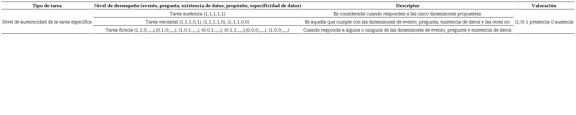 En esta línea, el diseño de tareas auténticas presenta la concreción de cinco dimensiones, basados en el modelo de Palm (2008): (a) Evento, es una situación contextualizada y situada fuera de la escuela; (b) Pregunta, presenta concordancia con la situación equivalente a fin de plantearse el evento descrito; (c) Existencia de datos, permite ubicar los datos e inferir y relacionarlo con la vida real; (d) Propósito, busca que el estudiante pueda deducir que le pide el enunciado y su idoneidad con la situación contextualizada; y (e) Especificidad de datos, es aquella que busca describir el contexto de los objetos, personajes, eventos que permitan los detalles específicos y exactos de los datos para desarrollar las estrategias de resolución de los problemas, a fin de determinar si se trata de una tarea auténtica, verosímil o ficticia; en tal sentido se han utilizado códigos de descripción para el análisis de la resolución de problemas con base en la teoría de los autores (Cáceres et al., 2015; Chamoso y Cáceres, 2018; Paredes et al., 2020).
