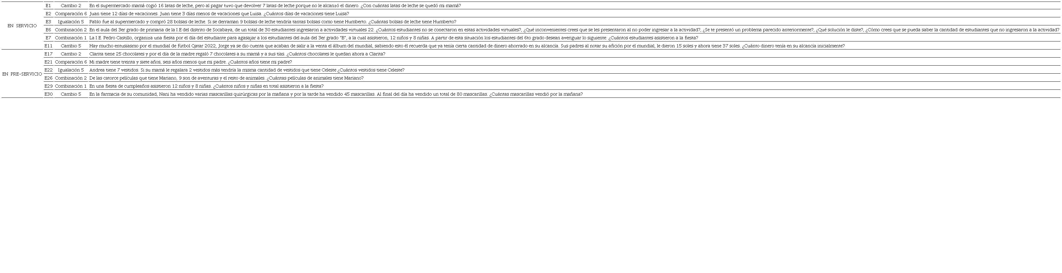 Del trabajo realizado con los docentes de pre-servicio y formación continua, se ha obtenido 30 problemas aritméticos de enunciado verbal. De los cuales se ha elegido al azar de manera equitativa 6 enunciados para cada caso, esto se puede visualizar en la tabla 4.