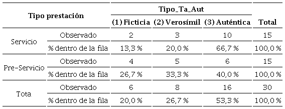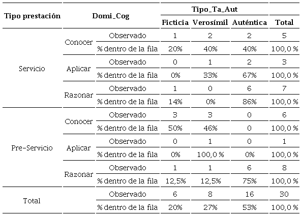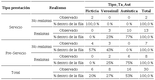 Se emplearon las tablas de contingencia para analizar la relación entre las dos variables, para interpretar los datos con base en cálculos de porcentajes, y analizar la significación estadística del desempeño docente en relación al tipo de prestación de las tareas auténticas, tipo de realismo y dominios cognitivos.