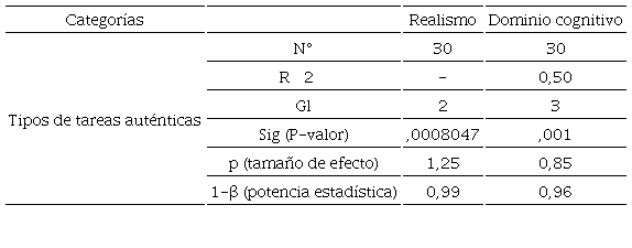 Se evidencia en la tabla 9, que el tamaño de efecto del tipo de tarea auténtica sobre los dominios cognitivos es muy grande, también que la potencia estadística es igual a 0,96; lo que significa que la probabilidad de aceptar la hipótesis nula es de 4%, es decir, es falsa. En cuanto, a la asociación entre el tipo de tarea auténtica y realismo de los enunciados creados por los docentes en servicio y pre-servicio se evidencia la existencia de una gran influencia del tipo de tarea auténtica sobre el realismo; asimismo se observa una potencia estadística de 0,99; es decir, la probabilidad de establecer o aceptar la hipótesis nula es de solo 1%, lo que significa que esta es falsa. En ese sentido, sobre las asociaciones realizadas, se evidencia, que, a pesar de la muestra, las variables de estudio se asocian de manera significativa con gran influencia de la independiente sobre la dependiente.