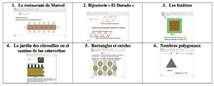 Pour la quatrième SP, une suite de motifs figurés est proposée, qui a été pensée par l’équipe, il s’agit du «Camino de las calaveritas», celle-ci prend en considération le contexte mexicain, en s’inspirant de la tradition du jour des Morts (au Québec le contexte de l’Halloween a été utilisé). La cinquième activité sollicite des processus de généralisation complexes et sans contexte réel, la suite de motifs a été également construite par l’équipe de chercheurs. La sixième SP porte sur les nombres polygonaux et est destinée aux élèves du secondaire. Toutes ces SP sont consultables intégralement en anglais, en français et en espagnol sur le site: Hitt et Quiroz (2019). Dans les activités ont été priorisés la construction des représentations: dessin, verbal en mots et arithmético-algebriques (Figure 13).