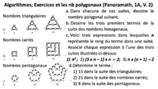 Un ordinateur était mis à la disposition de chaque équipe composée de 3 à 4 élèves. Dans cette école, le manuel scolaire choisi était Panoram@th (Cadieux, Gendron et Ledoux, 2005). Dans ce manuel, les auteurs présentent des nombres polygonaux dont les nombres triangulaires, carrés et pentagonaux. Ce numéro est plutôt un exercice de routine qui ne requiert pas de processus de générali-sation, l’élève doit réfléchir à partir de représentations algébriques institution-nelles qui sont données (Figure 5).