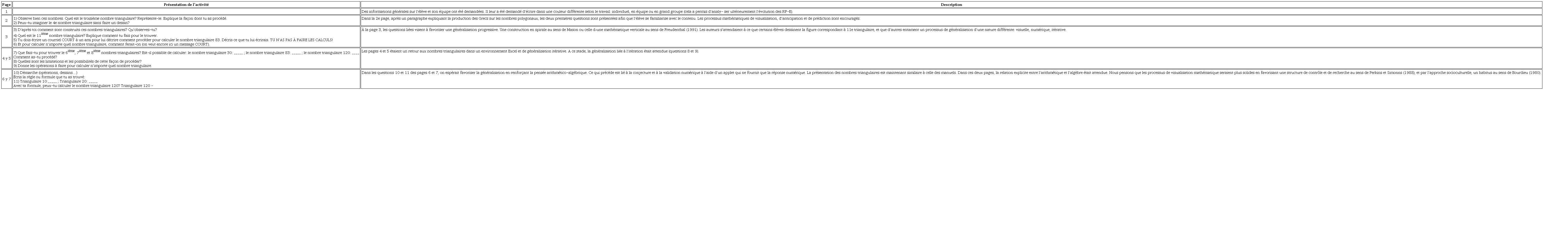 Les quatre premiers nombres triangulaires étaient présentés sous forme de triangles rectangles isocèles au lieu de triangles équilatéraux (comme c’est le cas pour le manuel Panoramath) pour ouvrir au recours à la for-mule de l’aire d’un triangle,6 et promouvoir un conflit cognitif.